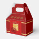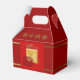 Recorte de papel del Buey Rojo en pintura asiática con saludo en inglés en la parte delantera (letra dorada y sombra no personalizable) + saludo chino. Diseño en caja de favor de Gable. Puede cambiar fácilmente el color de fondo haciendo clic en el botón personalizar. Disponible en otros estilos de cajas de favor (cubo, tienda, para llevar). Bolsa de regalo, tarjeta de felicitación, postal y otros productos de manualidades a juego. Perfecto para el Año Nuevo Chino del Buey 2021.