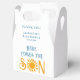 Esta bonita caja de favores para bebés con la temática del sol cuenta con un ilustracion acuarela de un sol amarillo y "Here comes the Son" en una elegante tipografía azul retro. Perfecto para la ducha de bebé de un niño. Personalizable fácil. Acuarela original © Michele Davies.