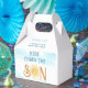 Esta bonita caja de bienvenida con decoración temática suntuosa cuenta con un ilustracion acuarela de un sol amarillo sonriente, cielo azul y "Here comes the Son" en una elegante tipografía retro. Perfecto para la ducha de bebé de un niño. Personalizable fácil. Acuarela original © Michele Davies.