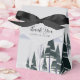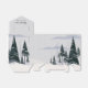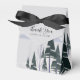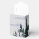 Una encantadora escena invernal de un bosque nevado de abetos y pinos verde oscuro y un cielo gris claro adorna esta caja de favores para una fiesta navideña para una boda o gala de Navidad. Este dibujo moderno de un paisaje natural nevado es perfecto para un evento en una noche de diciembre o enero.