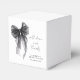 Cajas elegantes para despedida de soltera con un arco de coqueta negro de acuarela, "con amor y gracias" en una tipografía de caligrafía moderna, y el nombre de la novia y la fecha de la despedida en letra sencilla.