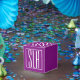 Texto blanco y marco blanco sobre morado (color de fondo cambiable).