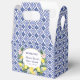 Este encantador, hermoso y fresco diseño de cajas de favor para despedida de soltera presenta vibrantes limones acuarela con delicadas rosas rosadas, complementados con un intrincado patrón de azulejos italianos mediterráneos azules con tipografía de letras azules. Estas cajas de favor prometen traer el encanto del Mediterráneo a tu fiesta de despedida de soltera. Texto fácilmente personalizable y editable.