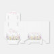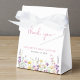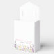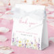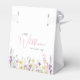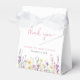 Cajas de favor lindas para tu baby shower de niña con "gracias" y "una pequeña wildflower está en camino" mostradas en tipografía gris claro y una elegante letra cursiva rosa y acuarelas inspiradas en boho de flores silvestres púrpura, rosa y amarillo. Personaliza el nombre de la madre y la fecha del shower en letras simples rosas y grises.