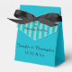 Qué maravillosa caja de favores de partido personalizada para un Boda u otra ocasión especial. Esta caja de favores está decorada con un patrón de rayas azules y verdes. En la parte delantera, Nombres y fecha de evento en negro. Al frente y al revés "Gracias por celebrar con nosotros" (o tu texto personalizado). Una cinta negra completa el aspecto festivo. Moderna, elegante y moda caja de favores de boda. Todos los derechos reservados © 2015 Alan & Marcia Socolik.