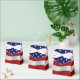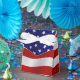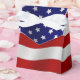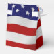 Estilo de carpa con caja de favoritas de cinta blanca con una imagen de una bandera norteamericana ondeando y los "años 1940" impresos en el frente en negrita en números negros y grises. Ver confeti coincidente, gran bolsa de regalo, etiqueta de regalo, pegatina cuadrado y papel de envoltura. Ver la colección Patriotic 40s Favor Box en los TOUCHES ESPECIALES | Sección de favoritos de partido.