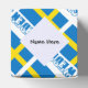 La bandera sueca, azul con una cruz nórdica amarilla, y la palabra SUECIA abajo, en azul con letras nevadas. El diseño está embaldosado para el efecto artístico. Un espacio blanco de cuadrados chillones tiene un lugar para tu nombre con un toque personalizado. Si desea crear un regalo personalizado, simplemente agregue el nombre de otra persona.