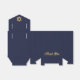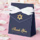 Una caja de favores azul marino y dorada para el bar mitzvah de un niño. En la solapa, tiene una estrella de David de falso oro.