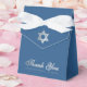 Una caja de favores azul clásica para el bar de un niño mitzvah. En la solapa, tiene una falsa estrella de Relieve metalizado de plata de David. El mensaje Gracias está escrito en la parte inferior, en un elegante guión falso de plata, la ocasión y la fecha están escritas en mayúsculas grises debajo. El fondo es azul clásico.
