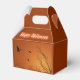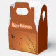Un ilustracion de silueta de Halloween con murciélagos negros espeluznantes y árboles espeluznantes con un saludo "Happy Halloween" en un naranja místico.