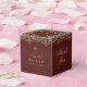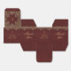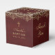 Una caja de favores burdeos con aire vintage, para un fiesta de bautismo chica. La solapa está decorada con oro de época y una cruz de oro en el centro. Hay decoraciones similares en los bordes superiores de todos los lados. En dos lados opuestos, está el mensaje Gracias, escrito en un elegante guión caligráfico. En los otros dos lados, el nombre está escrito en la misma caligrafía, el resto en mayúsculas. Todo el texto es dorado, como el marco, y se puede cambiar. Hay una cruz de oro encima del nombre. Las decoraciones doradas vintage del burdeos provienen de una antigua portada de libros encuadernada por Nicolas Denis Derome le Jeune (1731-1790) para el libro "Gaspar Pergam Epistol", ahora de dominio público.