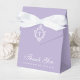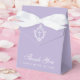 Una caja de favor de lavanda para un bautizo. En la solapa, tiene una cresta blanca con una cruz en ella.