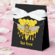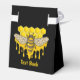 Abeja de miel con alas abiertas icono sobre colmena de abejas y gotas de miel. Color de fondo personalizado. Texto personalizado en ambos lados.
