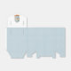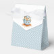 Caja de favores azul con puntos de polka blancos. En la parte delantera hay una imagen de un pájaro bebé que nace de un huevo azul. Ilustrado y diseñado por Patricia Álvarez.