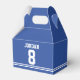 Blue Football Jersey - Kids Sports Theme Birthday Party Favor Box. Perfecto para el fútbol, el fútbol, el baloncesto, el hockey y muchas fiestas de cumpleaños temáticas deportivas. Haga clic en el botón personalizar it para personalizar el diseño eligiendo el color de fondo que desee e incluso agregue su propio texto.