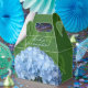 Caja de favores de boda floral azul con mango y texto personalizado. Gracias a los invitados por asistir a una ducha o boda (que también trabaja para fiestas de cumpleaños) con cajas lindas llenas de golosinas. El guión azul claro está impreso en cajas verdes oscuras con flores azules claras en el frente y en la parte posterior. Las grandes flores de hidrangea forman parte de la línea de diseño "Blue Heaven".