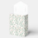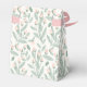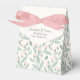 Delicados capullos de flores rosadas pastel y diseño de caja de favor de hojas verdes salvia.