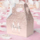 Caja de favores con brillo de oro rosa bastante femenino, nombre de escritura elegante y monograma en un fondo rosa blush. Diseñado por Thisisnotme©
