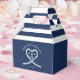 Caja de favores de matrimonio a rayas azul y blanco para una novia y un novio. Ideal para un boda de la Marina (militar) o de la casa del lago. El diseño presenta una cuerda en forma de corazón con ancla y dos iniciales en el medio. Personalízalo con los detalles de su boda.