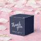 Moderno Script Navy Blue Wedding Favor Gift Box con la palabra ‘Gracias' en blanco y moderno tipo de letra con nombre y fecha en moderno sans serif fuente sobre fondo azul marino.