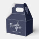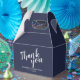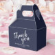 Moderno Script Navy Blue Wedding Favor Gift Box con la palabra ‘Gracias' en blanco y moderno tipo de letra con nombre y fecha en moderno sans serif fuente sobre fondo azul marino.