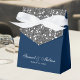 Caja de favores de boda personalizada en azul y plata.