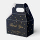 Una caja de favores azul marino oscuro con estrellas doradas para una temática marina y boda celeste dorado. En ambos lados, tiene el mensaje Gracias y los nombres en caligrafía elegante (y la fecha en dígitos más pequeños bajo los nombres). Todo el texto es dorado y se puede cambiar. La foto de noche estrellada es de Felix Mittermeier de Pixabay y es gratis para uso comercial.