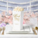 Una caja de regalo de boda con fondo blanco con las palabras "Gracias" en hoja de oro falso y espacio para los nombres y fecha de la boda de la novia y el novio.