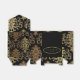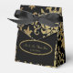 Magnífico damasco de oro en caja de favores de fondo negro. Agregue su nombre en script y la fecha. ¡Elegancia absoluta! Magnífico acento de cinta satinada.