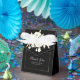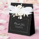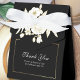 Esta elegante caja negra hará que sus huéspedes se sientan especiales. Su guión blanco Gracias y mensaje se acentúa con un clásico ramo floral dorado y blanco con un marco dorado. En la parte trasera se encuentra el nombre de la pareja con el mismo marco y acento floral.