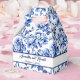 Una caja de favores matrimoniales con un diseño de tela floral azul y espacio para el nombre de la novia y el boda.