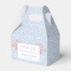 Elegantes cajas de favores con fondo de patrón de clave griega azul claro y blanco, un frasco de jengibre acuarela lleno de tallos de flores de cerezo rosa a cada lado del panel frontal, junto con el texto personalizado.