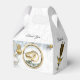 Espumosos adornos de árboles dorados y plateados rodeados de follaje festivo de color verde salado, con nieve recién caída en un maravilloso país invernal, para su día de bodas con temática de Navidades.