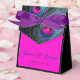 Bellas cajas de favores de boda verde azuladas azules y rosadas. Puede personalizar esta elegante caja real, verde azulada azul y rosa caliente de la pluma de pavo real con su texto en el estilo de letra que desee, añadir un color de fondo y cambiar el color de la cinta.