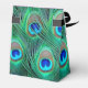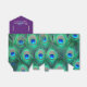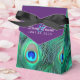 Cajas elegantes de regalo de boda con plumas de pavo real en ciruela morado y esmeralda verde vibrante, azul real y azul turquesa. Puede cambiar el color del lazo, agregar texto en el estilo de letra, tamaño y color de su elección en esta hermosa caja de regalo de boda de pavo real morado ciruela.
