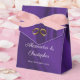 Una elegante bolsa de regalo morada con favores para bodas, con un lujoso patrón de seda morada y giratoria. Hay un par de bandas de bodas de oro en la parte superior debajo de la cinta, y todos los detalles, incluidos los nombres de novias y novios y la fecha de boda, pueden ser fácilmente personalizados en las opciones de personalizar anteriores. Tenga en cuenta que esto es en realidad parte de una suite boda más grande que coincide, que incluye invitación coincidente, invitaciones, guardar la fecha y más aquí: https://www.zazzle.com/collections/purple_silk_and_gold_wedding_rings-119740320521525107