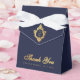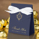 Una elegante caja de favores de la marina y la boda de oro. En la solapa, tiene un falso escudo de Relieve metalizado de oro con un monograma, de 2 iniciales. El mensaje Gracias está escrito en la parte inferior, en un elegante guión falso de oro, la ocasión y la fecha están escritas en gorras doradas debajo de ella. El fondo es azul marino.