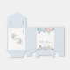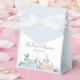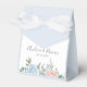 Romántica caja de favores de boda floral con colores polvorientos azules y rosados.