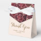 Esta elegante caja de favores matrimoniales incluye una floral burdeos con las palabras "Gracias", sus nombres y fecha boda para personalizar en un fondo rosa rubor. Diseñado por Susan Coffey.