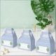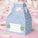 Elegantes cajas de favores con un patrón de clave griega azul y blanco, acompañadas de bolas topiarias de madera de Boxwood pintadas a mano en planchas de jengibre. (Si lo desea, puede borrar el topiario de Boxwood mediante la herramienta de diseño. Debajo de los cuadros de personalización de texto, "haga clic en el personalizar más adelante"). De forma similar, puede cambiar el color de contraste en el patrón de clave griega (actualmente un azul clásico) cambiando el color de fondo en el panel de la capa inferior. De nuevo, esto está dentro de la herramienta de diseño.