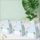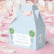 Elegantes cajas de favores con fondo de tónica griega azul cielo y blanco, el escudo de monograma de la pareja a cada lado y el topiario de paja en el panel frontal, junto con el texto personalizado.