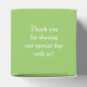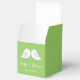 Esta caja de favores matrimoniales incluye un par de lindos pájaros amorosos uno frente al otro. La parte superior de la caja incluye texto de personalizable para que añadas tu mensaje personal de agradecimiento o te vayas mientras dice: "Gracias por compartir nuestro día especial con nosotros". La parte delantera de la caja, debajo de los pájaros amorosos, es el texto de personalizable para los nombres de la novia y el novio y la fecha de su boda. El color de fondo es verde limón.