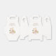 festejando nuestra caja minimalista de favores para bebés de oso de peluche, con un oso de peluche acuarela sentado en una cuna y juguetes para bebés.