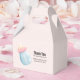 Una minúscula caja de favores con una imagen caprichosa de una botella de bebé azul claro con una llanta rosa. Un lindo fondo de puntos de polka.
