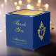 An elegant blue and gold favor box, recommended for a boy's religious confirmation. The flap is mostly faux gold foil. The rest is royal blue.