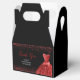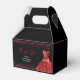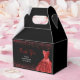 A beautiful bright red themed elegant watercolor dress gown on a black background with faux glitter at the top and bottom of the favor box.