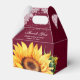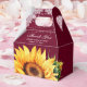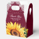 Ponga sus regalos de novia/de boda en estas románticas cajas rústicas borgoñonas de flores con un girasol en un fondo de burrega adornado con encaje floral blanco y luces de cuerdas.