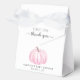 Cajón de favores de la fiesta de bebé con "gracias" en una simple tipografía gris y un guión elegante con toques y una acuarela de calabaza rosa.