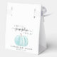 Cuta caja de favores de la fiesta de bebés con "gracias" y "una calabaza dulce está en camino" en una simple tipografía gris y un guión elegante con toques y una acuarela de una calabaza azul.