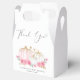 Una caja de favores tierno, alegre y bonito para las duchas de una bebé invitados con "A Sweet Little Pumpkin Is On Her Way" y "Gracias" escritas en una mezcla de tipografía gris suave moderna y escritura elegante con un toque cardíaco, y una acuarela de calabazas y flores de color rosa pastel y blanco con acentos purpurinas de oro. Personalice fácilmente el nombre de la madre y la fecha de la ducha de bebé en una simple tipografía gris claro.